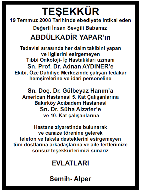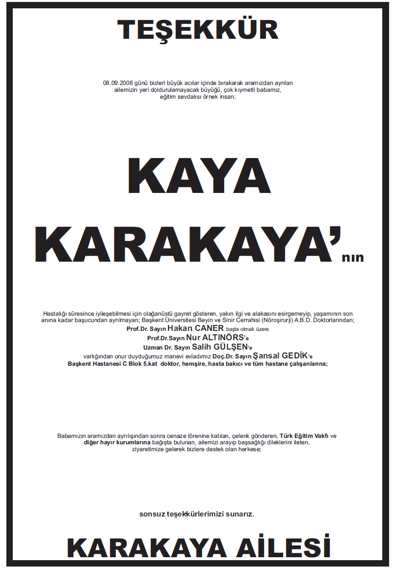 Hastamızın hastalığını iyileştiren doktorlara,hastane personellerine ,hemşerilere veya cenazenizde sizleri yanlız bırakmayan dostlariniza şükranlarını ve teşekkürlerini sunmak için verilen ilanlardır.