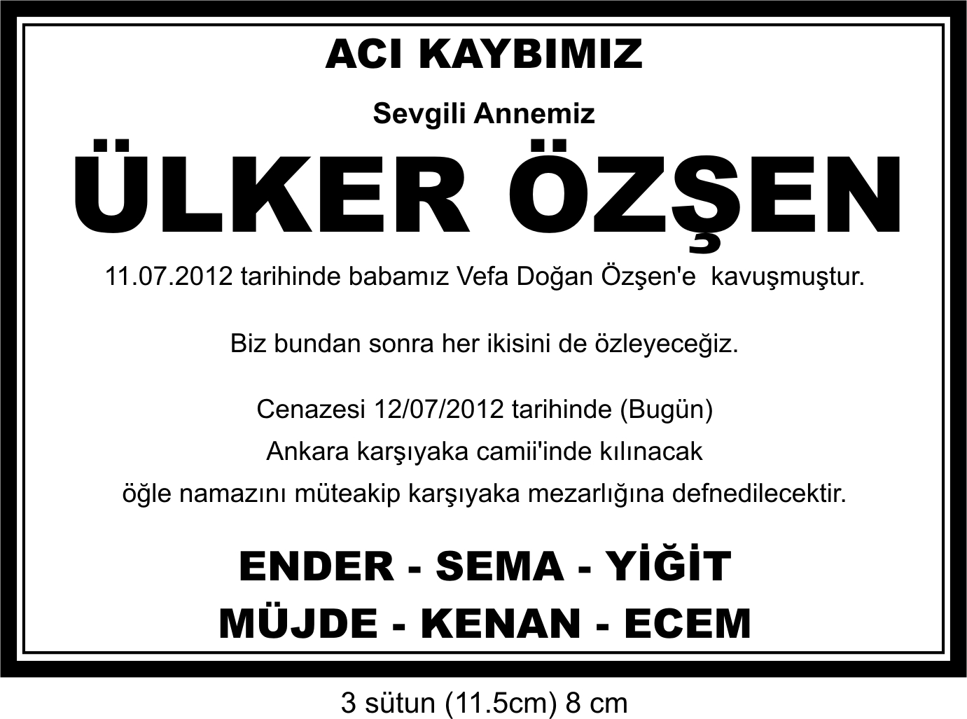Bir yakınıızı veya aile dostunuzun vefat etmesi durumunda yaşadığınız üzüntüyü paylaşmak için , cenazenize aile dostlarınızı ve tanıdıklarınızı çağırmak amaçlı ve vefat eden kişinin ölümünü duyurmak amaçlı verilen ilanlardır