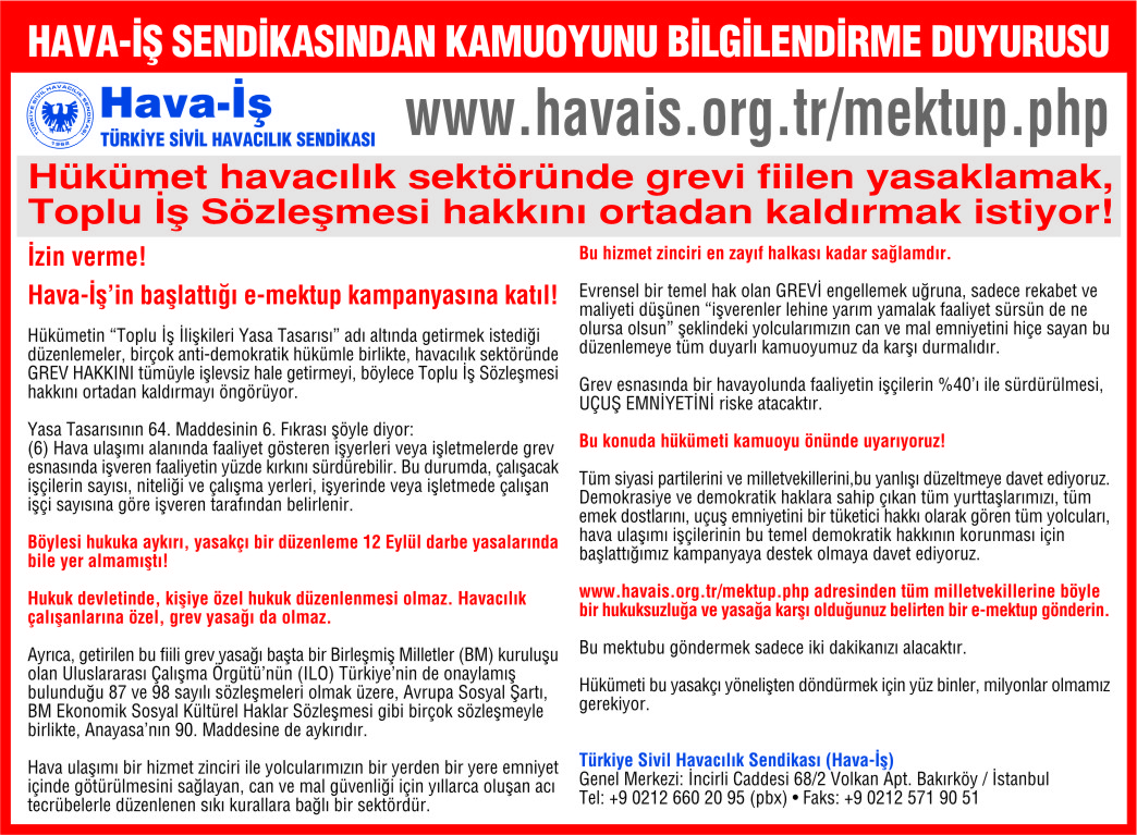 Hava-iş Sendikası kamuoyu duyuru ilanı Ajansımız tarafından 02.03.2012 tarihinde Hürriyet, posta, Cumhuriyet, Sözcü, Taraf, Yurt Gazetelerinde yarım sayfa Ve Radikal gazetesinde tam sayfa olarak yayınlanmıştır.