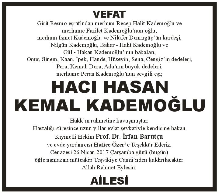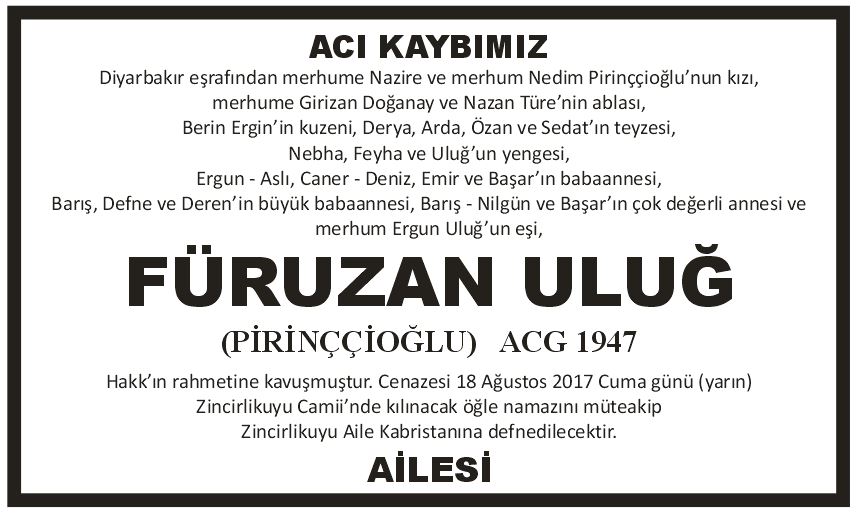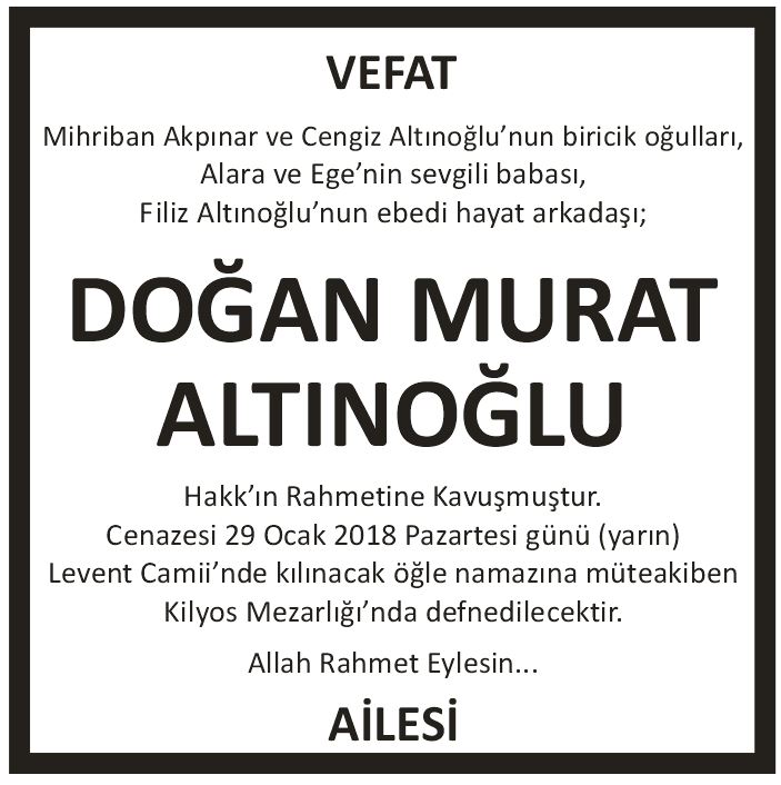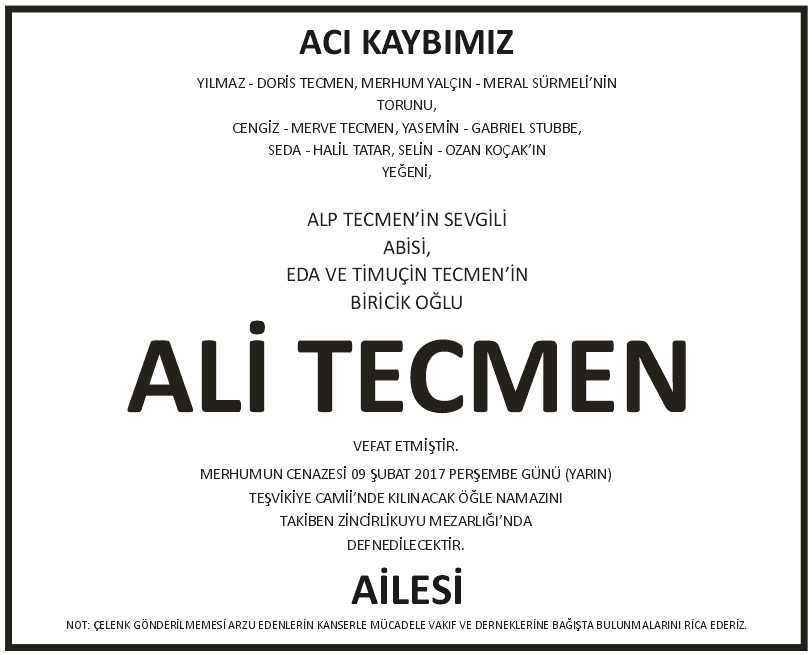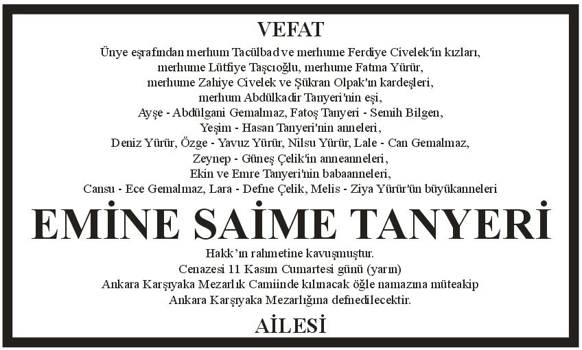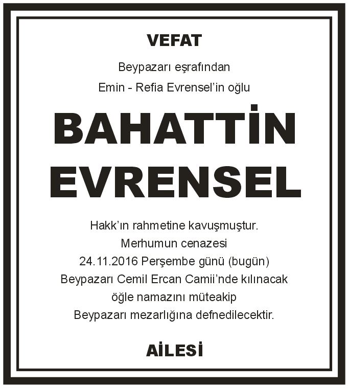 Bir yakınıızı veya aile dostunuzun vefat etmesi durumunda yaşadığınız üzüntüyü paylaşmak için , cenazenize aile dostlarınızı ve tanıdıklarınızı çağırmak amaçlı ve vefat eden kişinin ölümünü duyurmak amaçlı verilen ilanlardır